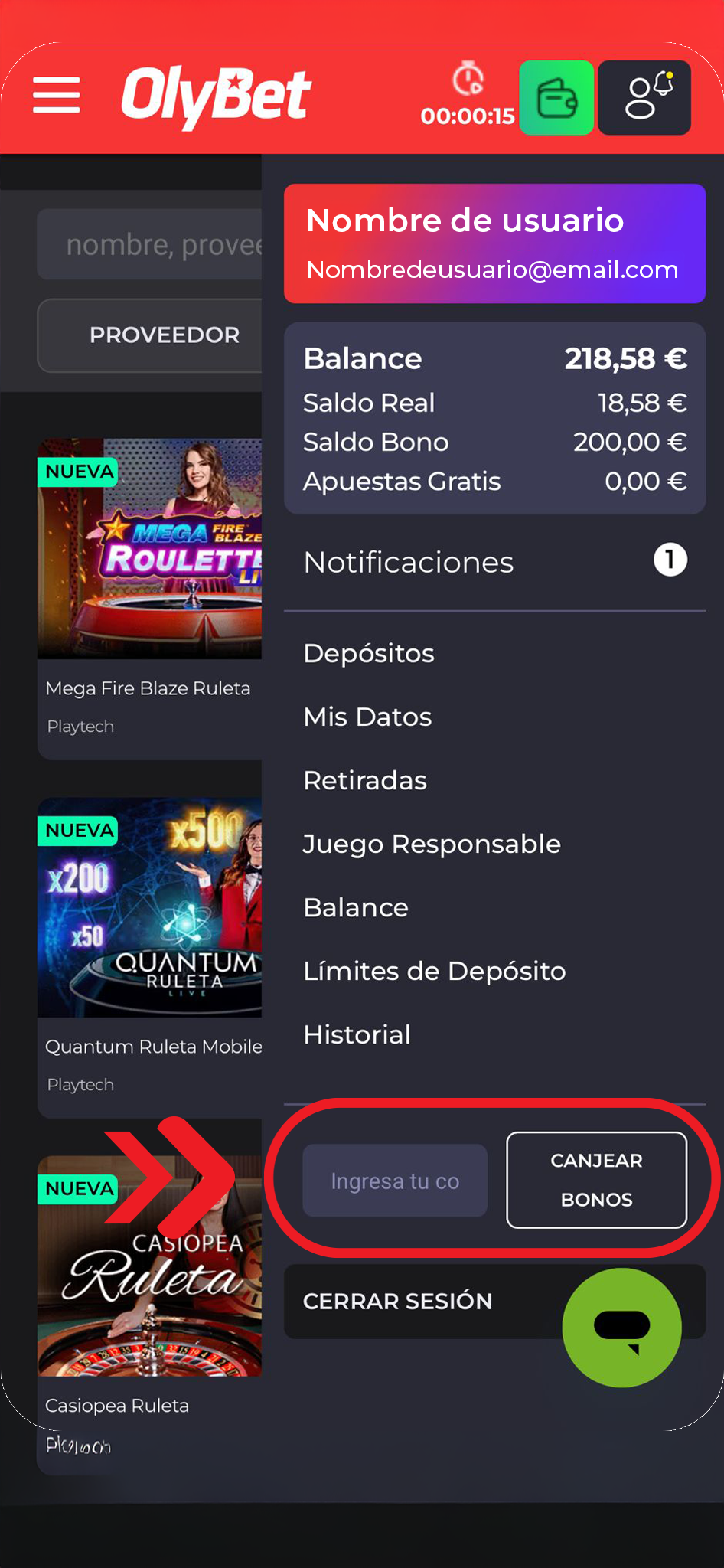 Tras haberte registrado, haber verificado tu cuenta y haber realizado tu 1er depósito de mínimo 20€. Añade el código OLYCHECKER en el menú del usuario.
